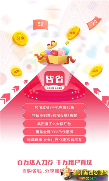 皆省app是网购省钱工具,有海量商品资源,设团购攻略。界面简洁,操作流畅,定期更新优惠。新人专享礼包,百万补贴,全部包邮还赠运费险。能满足全场景购物需求,领外卖红包,快来下载。