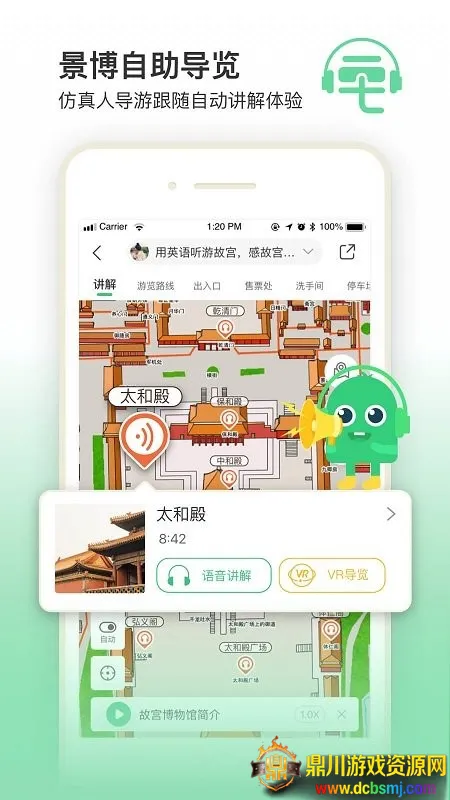 专利微定位纠偏自动触发讲解:借助自主专利 GPS 微定位景区导览技术,实现仿真人导游跟随自动讲解体验,走到哪听到哪。