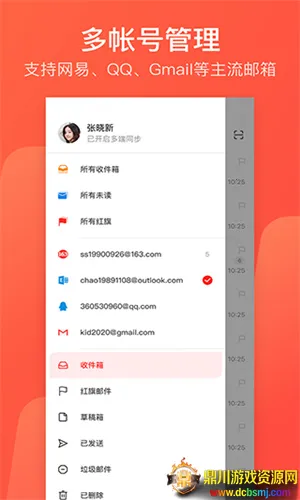 支持多邮箱集成管理,可添加网易、QQ、Outlook等主流个人邮箱,所有收件箱和聚合文件夹清晰呈现,不同邮箱来信能轻松区分,集中处理更便捷。
