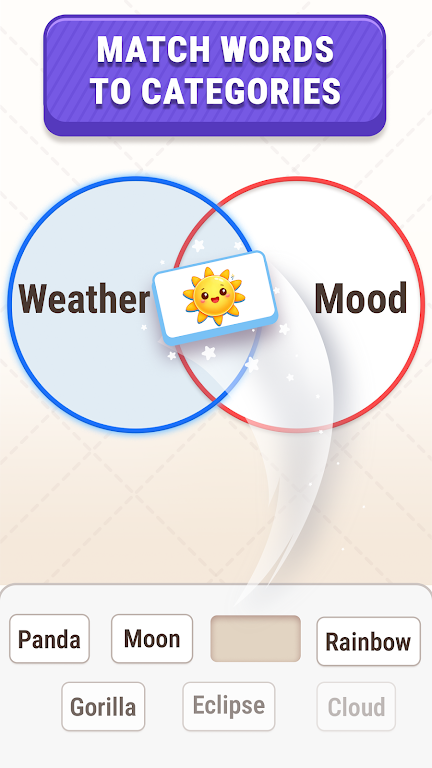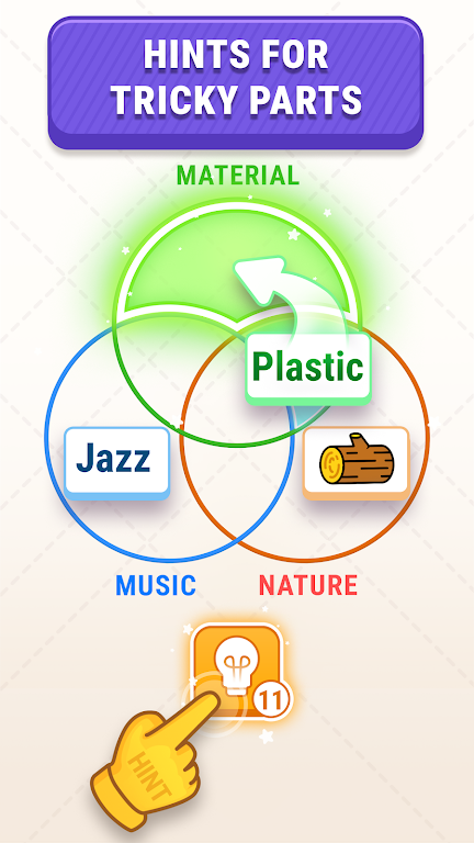 3. 多样化谜题设计:谜题富有挑战性,简单明了又出乎意料。关卡有多个环重叠区域及意想不到的类别组合,考验创新思维与反应能力,能满足不同玩家需求。