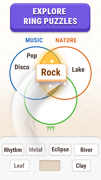 1. 独特游戏机制:核心玩法别具一格,单词被赋予特殊意义,玩家拖动单词到合适环中,需运用逻辑推理与直觉识别词汇联系,强调词汇层次与关联,区别于传统文字游戏。