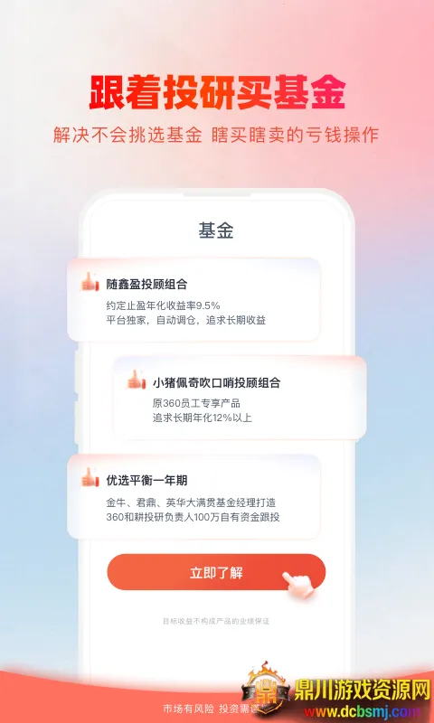 360你财富是一款智能化财富管理软件,能为你解决财富管理的诸多问题。它延续360安全保障,确保账户和信息安全。这里有新手专享福利,限时加息还能领300元现金;邀请好友赢现金,邀友投资最高拿1000元大奖。精选优质产品,银行活期最高4.7%,灵活存取,50万内本息保障。千余款基金任你挑选,组合策略稳健灵活,申购费1折起,还有止盈提示。提供在线金融知识教育,涵盖财商培养、理财投资等课程。活期理财收益高,是余额宝2倍、银行活期18倍,一分起投,随存随取,新人翻倍。定期理财有1月、3月、6月等期限,不定时发售,安全稳健。顶级基金经理精选精品基金。有了360你财富,财富管理轻松又便捷,值得拥有。