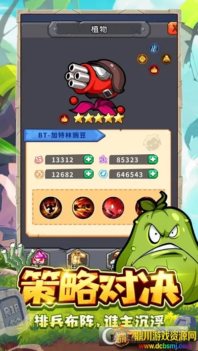 4. 多样策略玩法:玩家要根据僵尸属性和攻击方式合理种植植物,尝试不同配兵方案。合理布置不同功能植物可发挥最大伤害,随机合成卡牌搭配阵容,面对快速生成的植物施展谋略,非常考验玩家策略。