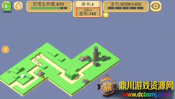 4、当有敌人攻进去宝塔时,上方的巨塔生命值就会开始减少,你要做的就是通过已有的金币在巨塔附近设置防御武器,去攻击那些侵略我们巨塔的敌人。