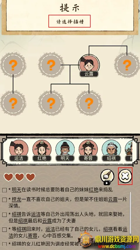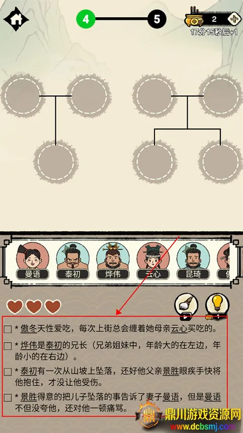 2、进入关卡后,玩家需要根据下方文字提示,将人物头像拖入上方合适圆框内,进行族谱的修缮。