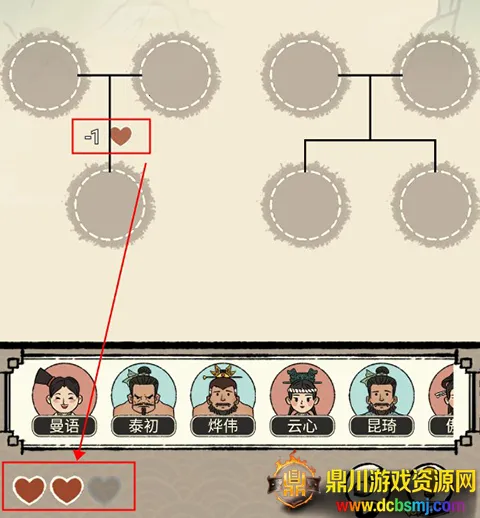 3、如果拖入的人物与圆框不不对应,会扣除血量,三格血量全部扣除即为失败,因此玩家需要小心判断。