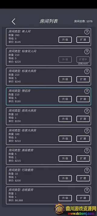说说我的玩法,初期别开套房、高级大床、行政套房、总统套房,我三星了这些也住不满,然后走量的单人、标间、情侣、大床、街景等切记别升级太高,升级高了房价提升影响入住率,钱多了就慢慢扩张那些走量的房型。